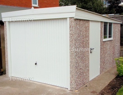 PICTURE: A pent roof concrete garage with spar finish, vertically ribbed up and over door, steel personnel door and PVCu fascias.
