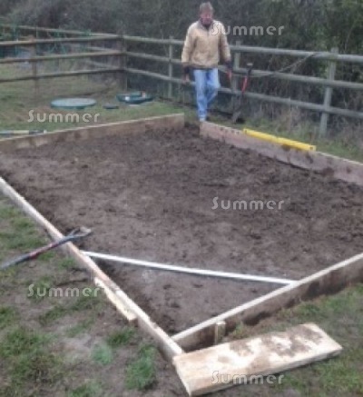 A tape measure should be used to mark out the area of the base. The corners can be marked with canes or bricks. To ensure that the area is square the two diagonal measurements should be the same. The edges are easier to cut with a straight edge such as a wooden plank and a spade or turf cutter. All vegetation and roots should be removed otherwise as the organic material decomposes the base may settle unevenly. Large trees should only be removed by professionals. Small trees and shrubs can be removed by untrained people if care is exercised. To remove turf cut horizontally using a spade just below the roots at a depth of around two inches.