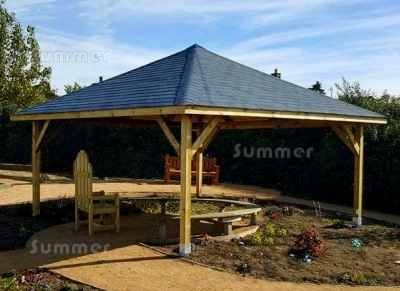 CEDAR ROOF SHINGLES: Attractive and durable, cedar shingles make the ideal roof for high specification gazebos. These genuine cedar roof shingles are traditionally made from Western Red Cedar. The individual cedar shingles are laid over a felted solid pine inner roof. Each individual cedar tile is a known as a shingle. Cedar shingles have long been a popular roofing material for domestic and public buildings in large parts of North America where cedar shingles have a reputation for warmth and longevity. Cedar has an unrivalled reputation for durability and cedar shingles often last for many decades. We use only the highest grade of shingles which are 100% heartwood, 100% free from defects and 100% edge grain. Heartwood edge grain is the densest possible cut which ensures maximum durability. All fixings are covered by the next row of tiles, partly to ensure a neat appearance with concealed fixings but mainly to protect the fixing holes from any possible moisture.
