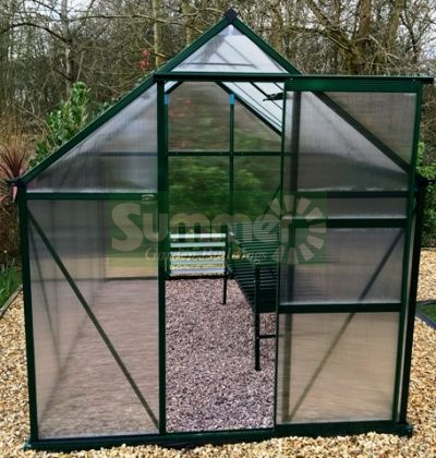 THIS POLYCARBONATE GREENHOUSE: These great value metal greenhouses feature green powder coated aluminium frames with durable twinwall polycarbonate glazing, which is normally an expensive extra. These sensationally cheap greenhouses are always in stock and the price includes fast delivery. From a technical viewpoint this greenhouse is heavier and more rigid than others at similar prices and the glazing is held in better. The precise manufacturing and careful packing is a match for our most expensive greenhouses. Sophisticated features include well retained clip free glazing, additional bracing and numerous specially designed brackets and clips to improve the strength. With such a competitive price this metal greenhouse is a popular choice with first time buyers. With the ultra safe polycarbonate glazing it is also a popular choice for the elderly and families with children or pets.