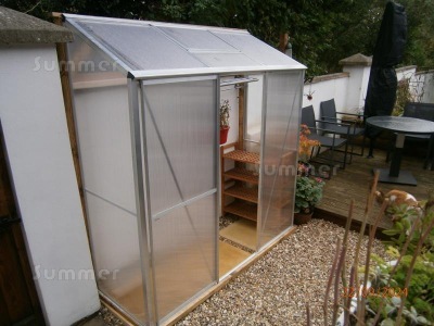 GREENHOUSE LOCATION: Ideally your greenhouse should have a clear space at least 18" wide on all sides, if possible. This ensures easy access for both installation and future maintenance. In reality this is often not practical and at many sites it is not needed. A reduced clearance is often possible on one or two sides. You should cut back or remove any nearby shrubs and trees. Remember to allow for future growth. The best position for a lean to greenhouse is against a south facing wall and outside the shadow of nearby buildings and trees. A sheltered position is best otherwise additional screening may be advisable. Polycarbonate glazing is not recommended at exposed sites. Plants need plenty of water so your greenhouse should be close to a water supply and the site should be well drained.