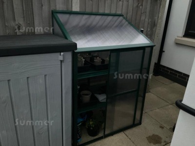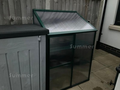 This aluminium growhouse is 3'3"x2'2" (1000mm x 650mm) with an overall height of 4'8" (1430mm). Standard features include two slatted shelves to provide extra growing space or storage. Other features include aluminium frames in a choice of anodised silver finish or powder coated green finish. A large sliding door is provided for easy access. The glazing is twinwall polycarbonate, which is far stronger than the polythene covers supplied with other mini greenhouses. It is virtually unbreakable, provides good insulation from frost and diffuses light to prevent scorching. This aluminium mini greenhouse is an ideal space saving solution for small gardens. A sheltered site against a wall is an ideal position, with good light but preferably not exposed to prolonged fierce sunlight.