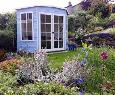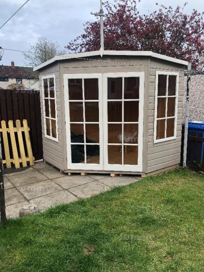 Pictures 1 and 2 show the 8'x8' corner summerhouse. Picture 3 shows the 7'x7' corner summerhouse. Pictures 4 and 5 show the 8'x8' corner summerhouse. Pictures 3 and 4 show what may be achieved using coloured preservatives.