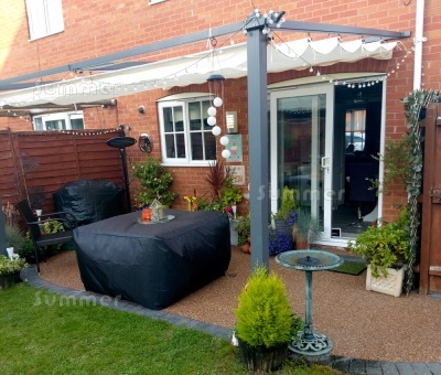 RETRACTABLE AND REMOVABLE SHOWERPROOF CANOPY: This gazebo features a retractable awning which can be folded away within seconds when not in use and pulled open just as easily. The canopy is also removable. At the end of the summer season the canopy should be removed for winter storage. The canopy should also be removed in windy weather. These simple measures will prolong the life of the canopy and protect your investment. The canopy is primarily a sunshade but it is also showerproof. It provides protection from light rain for a short period but some water ingress may occur during a prolonged downpour.