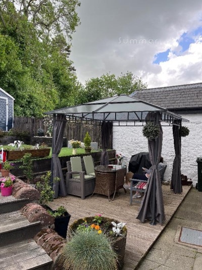 This low maintenance metal gazebo is approximately 8'6"x8'6" (2.6x2.6m). The overall roof size is approximately 10'x10' (3.0x3.0m). Standard features include a tinted twinwall polycarbonate roof and a powder coated steel frame. The base plates include pre-drilled holes for fixing down into concrete, paving, decking or a lawn. Polyester curtains are also included. The curtains are easily removed. Polycarbonate is increasingly popular as a gazebo roof due to the combination of durability, good light transmission and reduced glare. It is far stronger than a canvas canopy and provides good protection for garden furniture. Instructions are supplied for self assembly.