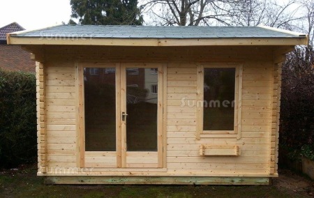 These log cabins are available in 4 depths and 4 widths. The depths excluding the roof overhang are 8' (2.4m), 10' (3.0m), 12' (3.6m) or 14' (4.2m). The widths are 10' (3.0m), 12' (3.6m), 14' (4.2m) or 16' (4.8m) wide. All timber is FSC® certified. The prices include roofing felt. Roof options include felt tiles, genuine cedar shingles and granular steel roof tiles. Other options include double glazing, roof insulation and floor insulation. Features include a choice of 28mm, 34mm, 45mm or 70mm thick wall logs. Other features include panoramic low level glazing with fully glazed double doors and a large front window. An attractive front roof canopy and toughened glass are included as standard. The ridge height is under 2.5 metres high to avoid planning restrictions. Detailed fitting instructions are supplied for DIY self assembly. Low cost installation is available in many areas.