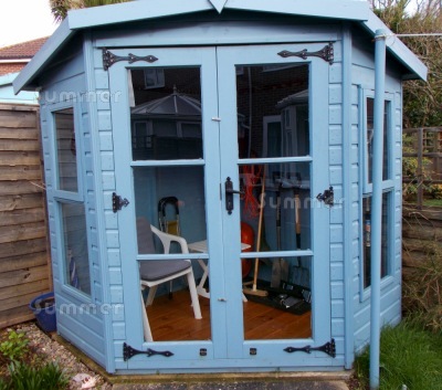 Pictures 1, 2 and 3 show the standard 7'x7' summerhouse with pine doors and without the optional preservative treatment (hardwood doors now supplied as standard). Picture 4 shows the floorplan.